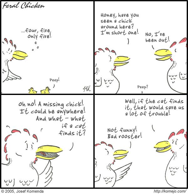 Although Sam seems to have gone from suspicion of the cat to complete trust, I think he's actually being a tiny bit cynical in his comments. He's probably enjoying pulling the hen's chain a little. Also, I don't think he worries about the chicks the way a hen does.