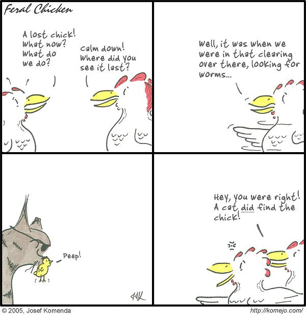 Oh dear, it looks like the sudden appearance of a cat with her child in its mouth may have taxed our little hen's faculties. Alas.