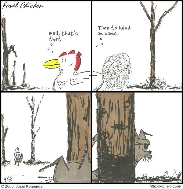 Ew, I don't like the tree in panel four. For some things, the brush pen is not so good. Close-up bark == not so good. I like the split on panels one and two though.