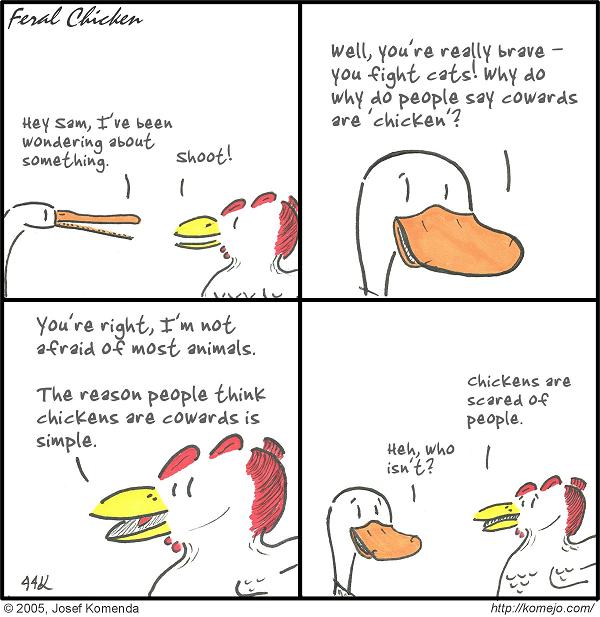 The start of a minor theme, regarding common phrases. Why do we think chickens are cowards? Roosters are really very brave, and will fight animals of almost any size if they think the flock is in danger.