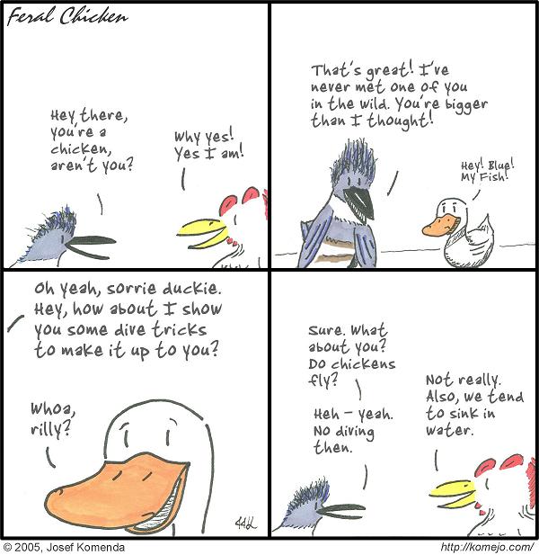 I had originally planned to use this toon to tell everyone what the little Kingfisher's name was, but the writing was flabby and un-funny, so I re-wrote it with this. Maybe Friday.